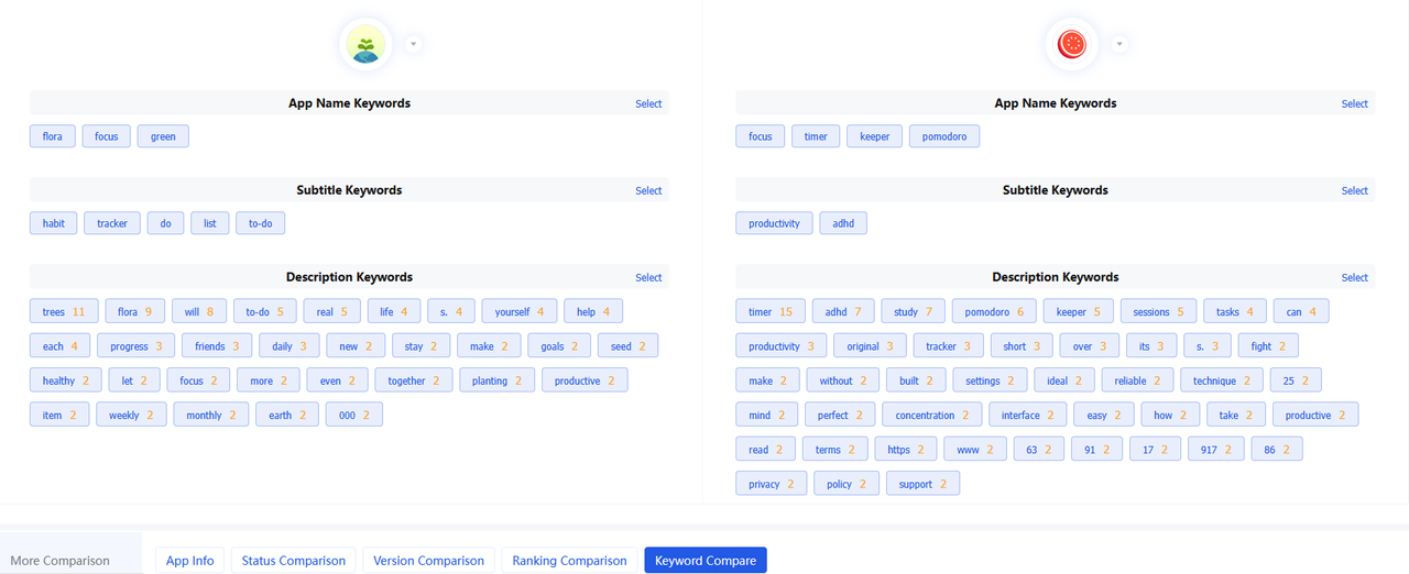 경쟁 상품 키워드 분석:5-10개의 직접 경쟁자와 업계 벤치마크 앱을 연구한다. UPUP과 같은 ASO 도구를 사용하여 TOP10에 있는 키워드를 역으로 조회한다. 제목, 부제목 및 높은 순위와 상당한 트래픽을 가진 단어에 주력한다. 이는 시장에서 검증된 효과적인 어휘를 빠르게 찾고 간과할 수 있는 맹점을 발견하는 데 도움이 될 것이다.