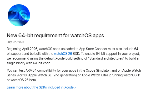 2025年7月22日、アップルは正式に発表しましたwatchOS アプリの新しい64ビット要件、App Storeに新規提出されるwatchOSアプリケーションはすべてネイティブで64ビットアーキテクチャ(ARM64)をサポートし、32ビットアーキテクチャ(ARM64_32)との互換性を段階的に廃止する必要があります。この方針は、アップルの全プラットフォームARM64化戦略が最終的に実現したことを示しており、開発者やユーザーのエコシステムに深い影響を与えることになります。本稿では、アップル公式ドキュメントと業界動向を参考に、技術的詳細、パフォーマンス向上、ユーザーエクスペリエンスなどの観点から分析を行い、開発者向けに具体的な適応提案を行います。