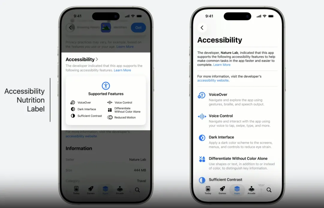 App Storeの製品ページに9つの新しいアクセシビリティタグ(VoiceOver、大きなフォント、音声コントロールなど)が追加され、開発者は実際の機能に基づいて正しくラベル付けする必要があります。
