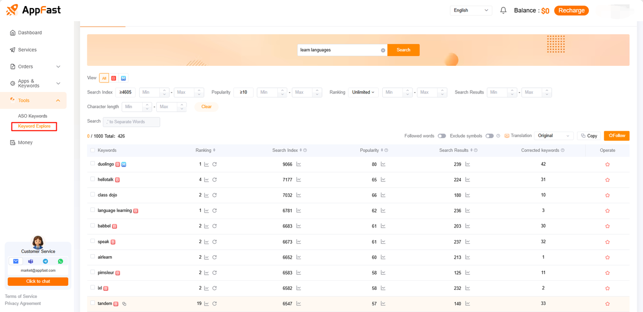 排名偵察:借助ASO工具AppFast,監控競品的關鍵字覆蓋總數、Top 10/Top 30高排名關鍵字列表,篩選出「高搜尋量、低競爭度、強相關」的詞。
