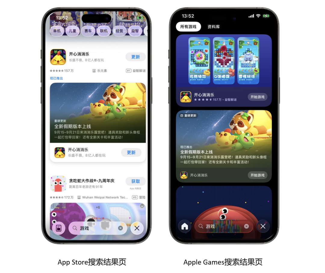 iOS 26 推出了名為 Apple Games 的新應用程式,整合了 iOS 平台的所有遊戲資源,提供統一入口,並預裝於所有 iPhone 和 iPad 設備。該應用採用卡片式展示結果,與 App Store 的傳統列表式不同,包含名稱、類別、截圖等豐富元素。